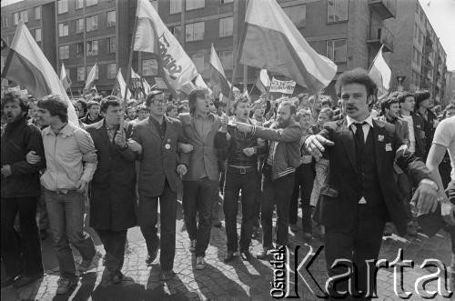 Niezależna manifestacja, demonstranci z transparentem "Wolność dla więźniów politycznych" na ulicy gen. Michała Tokarzewskiego-Karaszewicza.