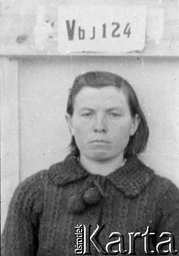 Prawdopodobnie Maria Milewicz po zdjęciu obozowego numeru, 1954 lub 1955 r.