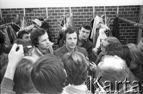 Obrady I Krajowego Zjazdu Delegatów NSZZ „Solidarność”. Na zdjęciu przewodniczący Zarządu Regionu w Bydgoszczy Jan Rulewski (w środku) rozmawia z dziennikarzami.