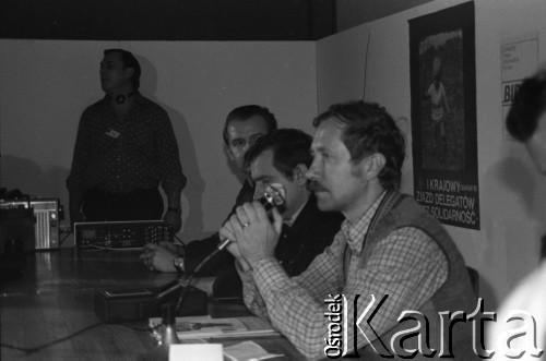 Konferencja prasowa BIPS (Biuro Informacji Prasowej Solidarność) podczas I Krajowego Zjazdu Delegatów NSZZ „Solidarność”. Na zdjęciu (od prawej) rzecznik prasowy Zjazdu Janusz Onyszkiewicz, przewodniczący Krajowej Komisji Porozumiewawczej NSZZ "Solidarność" Lech Wałęsa i przewodniczący Zarządu Regionu Pomorsko-Zachodniego Szczecin Marian Jurczyk.