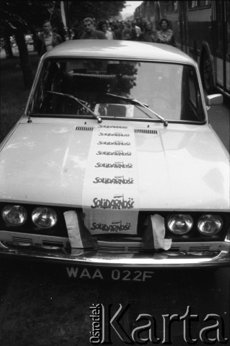 Kierowcy autobusów miejskich i ciężarówek zablokowali rondo u zbiegu ulic Marszałkowskiej i Alei Jerozolimskich. Protestowali w ten sposób przeciwko obniżce kartkowych przydziałów mięsa i trudnościom zaopatrzeniowym. Strajk został zorganizowany przez Zarząd Regionu NSZZ "Solidarność" Region Mazowsze. Na zdjęciu samochód, na którego masce umieszczono szarfę z napisem "Solidarność" i flagi.