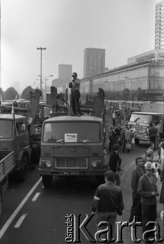 Kierowcy autobusów miejskich i ciężarówek zablokowali rondo u zbiegu ulic Marszałkowskiej i Alei Jerozolimskich. Protestowali w ten sposób przeciwko obniżce kartkowych przydziałów mięsa i trudnościom zaopatrzeniowym. Strajk został zorganizowany przez Zarząd Regionu NSZZ "Solidarność" Region Mazowsze. Na zdjęciu przewodniczący Krajowej Komisji Porozumiewawczej Lech Wałęsa wysiada z autobusu.