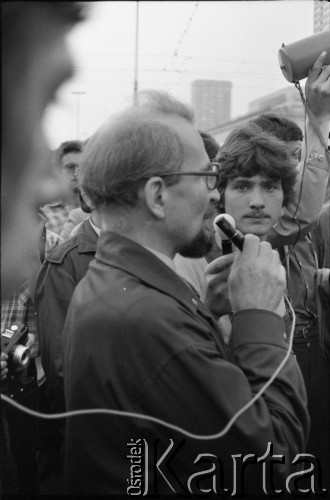 Kierowcy autobusów miejskich i ciężarówek zablokowali rondo u zbiegu ulic Marszałkowskiej i Alei Jerozolimskich. Protestowali w ten sposób przeciwko obniżce kartkowych przydziałów mięsa i trudnościom zaopatrzeniowym. Strajk został zorganizowany przez Zarząd Regionu NSZZ "Solidarność" Region Mazowsze. Na zdjęciu protestujący mężczyźni.