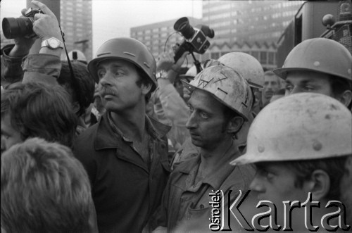 Kierowcy autobusów miejskich i ciężarówek zablokowali rondo u zbiegu ulic Marszałkowskiej i Alei Jerozolimskich. Protestowali w ten sposób przeciwko obniżce kartkowych przydziałów mięsa i trudnościom zaopatrzeniowym. Strajk został zorganizowany przez Zarząd Regionu NSZZ "Solidarność" Region Mazowsze. Na zdjęciu protestujący mężczyźni.