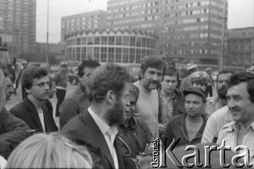 Kierowcy autobusów miejskich i ciężarówek zablokowali rondo u zbiegu ulic Marszałkowskiej i Alei Jerozolimskich. Protestowali w ten sposób przeciwko obniżce kartkowych przydziałów mięsa i trudnościom zaopatrzeniowym. Strajk został zorganizowany przez Zarząd Regionu NSZZ "Solidarność" Region Mazowsze. Na zdjęciu wiceprzewodniczący Krajowej Komisji Porozumiewawczej Andrzej Gwiazda rozmawia z protestującymi.