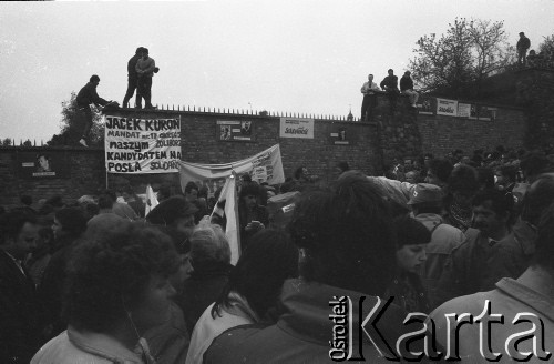 Manifestacja zorganizowana przez NSZZ "Solidarność". Wzięli w niej udział kandydaci na posłów i senatorów z ramienia opozycji. Na zdjęciu manifestanci, część z nich stoi na murze, na którym zawieszono m.in. transparent z napisem: "Jacek Kuroń (...) naszym kandydatem na posła".