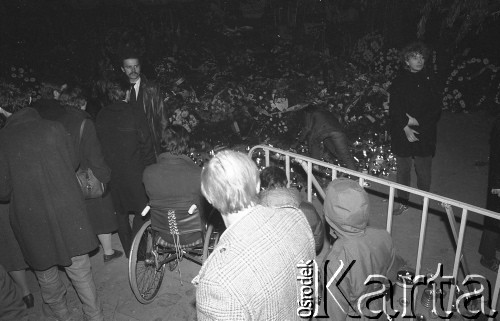 Pogrzeb księdza Jerzego Popiełuszki zamordowanego przez funkcjonariuszy Służby Bezpieczeństwa. Uroczystość odbyła się w kościele Świętego Stanisława Kostki na Żoliborzu, zgromadziła tysiące ludzi. Na zdjęciu ludzie przed ogrodzeniem, na którym zawieszono kwiaty i transparenty z napisem: „Ks. Jerzy przyrzekamy pokonać razem z Tobą czerwonego smoka”, „Orędownika prawdy żegnamy”.