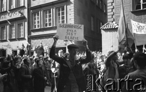 Manifestacja zorganizowana przez Solidarność w drugą rocznicę podpisania "porozumień sierpniowych". Ludzie zgromadzeni przy ul. Świętojańskiej przed katedrą św. Jana z transparentem "Uwolnić Solidarność".