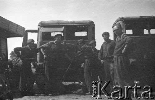 Baza remontowa traktorów w budynkach dawnej elektrowni, pracownicy przy ciężarówce.
