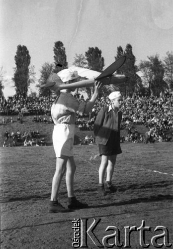 Pokazy modeli latających, grupa chłopców z modelami samolotów.