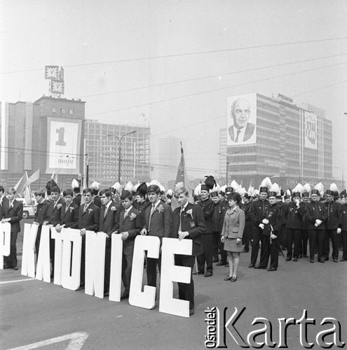 Pochód pierwszomajowy na ulicach miasta. Na pierwszym planie chłopcy w garniturach trzymający napis "[...] Katowice", za nimi górnicy w galowych strojach. Na ścianie budynku w tle wisi portert Władysława Gomułki.