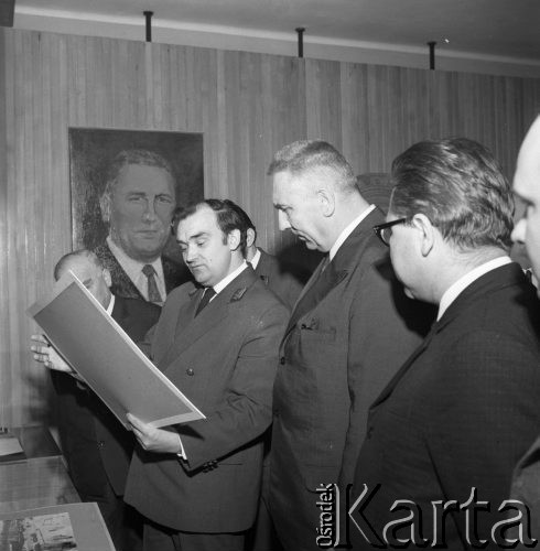 Edward Gierek, I Sekretarz KC PZPR z wizytą w kopalni "Generał Zawadzki", w tle na ścianie wisi portret Edwarda Gierka.