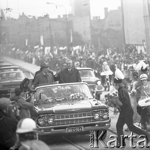 Obchody XXX-lecia PRL, uroczyste powitanie radzieckiej delegacji. Przejazd Edwarda Gierka i Leonida Breżniewa ulicami miasta, z prawej górnik z bukietem kwiatów podbiegający do samochodu.