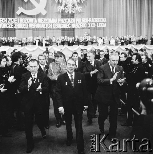 Obchody XXX-lecia PRL, Zdzisław Grudzień, Leonid Breżniew, Edward Gierek i Piotr Jaroszewicz przechodzą pomiędzy uczestnikami uroczystości. W tle hasło: "Niech żyje i rozkwita niezłomna przyjaźń polsko-radziecka. Twórcze źródło wspaniałych osiągnięć naszego XXX-lecia".