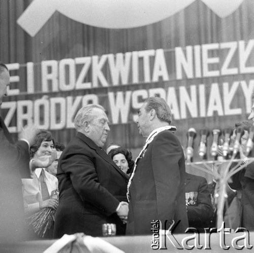 Obchody XXX-lecia PRL, pożegnanie radzieckiej delegacji, w środku z bukietem goździków stoi Leonid Breżniew, z prawej Edward Gierek, z lewej Zdzisław Grudzień.