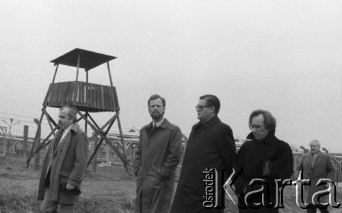 Członkowie Niemieckiej Partii Socjaldemokratycznej (SPD) z wizytą w obozie koncentracyjnym, w środku idzie przewodniczący niemieckiej delegacji Hans Koschnick.