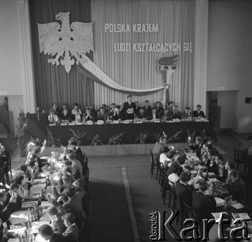 Delegaci w sali obrad podczas III Zjazdu Związku Młodzieży Wiejskiej. Nad stołem prezydialnym wisi hasło: "Polska krajem ludzi kształcących się".