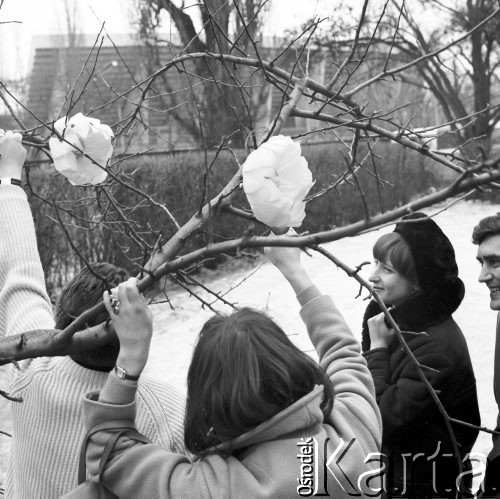Śnieg na ulicach, kobieta zamiatająca przejście dla pieszych, ulicą jedzie samochód marki "Warszawa".