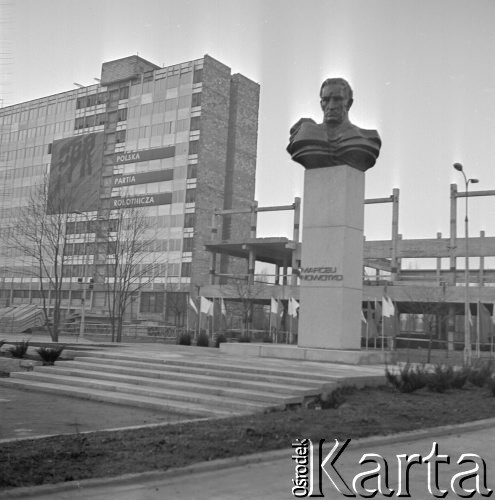 Popiersie Marcelego Nowotko przed zakładami jego imienia, na budynku transprent z napisem: "PPR. Polska Partia Robotnicza".