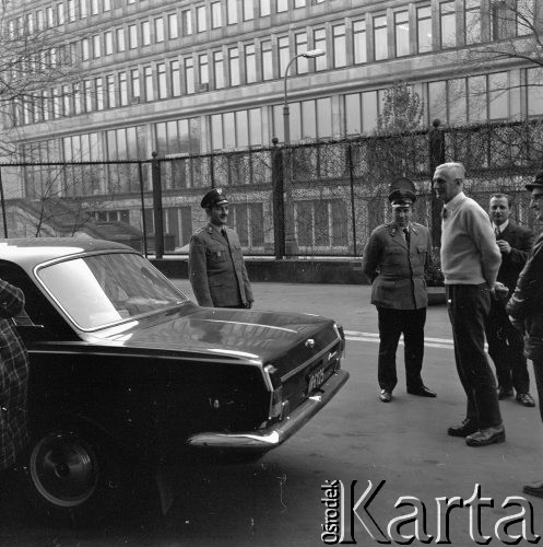 Muzeum Narodowe, przyjazd obrazu Leonarda da'Vinci "Dama z łasiczką", przed wejściem do MNW, pierwszy z lewej stoi Henryk Brandys, główny inwentaryzator MNW, dalej dr Marek Rostworowski z Muzeum Narodowego w Krakowie (kustosz zbiorów Czartoryskich, późniejszy minister kultury).