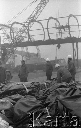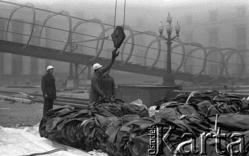 Montaż stalowych konstrukcji pod halę wystawową na placu przed Pałacem Kultury i Nauki.