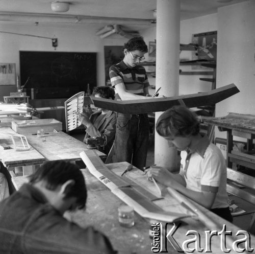 Osiedlowa modelarnia przy ulicy Nubijskiej 1. Chłopiec wykonuje model samolotu. Pracy dziecka przygląda się instruktor - pan Twardo.