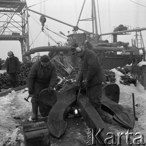 Stocznia remontowa im. "Adolfa Warskiego". Stoczniowcy przy pracy. Widoczny jest fragment statku "Nowy Sącz".