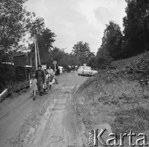 Grupa osób na błotnistej drodze, zalanej w czasie powodzi.