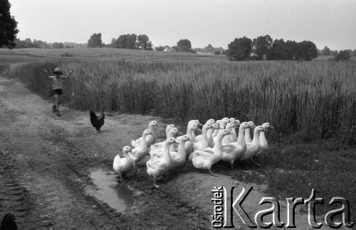 Gospodarstwo rodziny Grzybickich, stadko gęsi, kura i chłopiec na drodze.