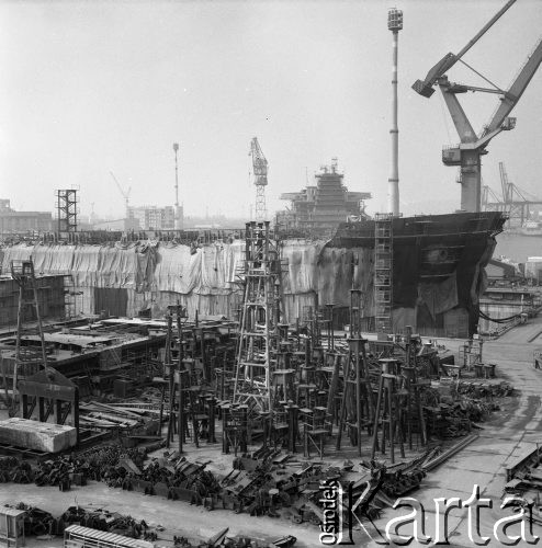 Stocznia im. "Komuny Paryskiej", zabezpieczenia na kadłubie budowanego statku, na pierwszym planie metalowe elementy konstrukcyjne.