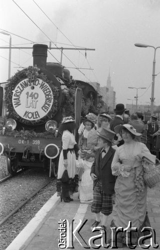 Lokomotywa pociągu z napisem: "140 lat Kolei Warszawsko-Wiedeńskiej", na peronie stoi grupa ludzi w strojach z epoki.