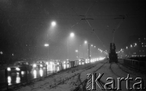 Samochody jadące ulicą w śnieżny wieczór, z prawej tory tramwajowe.
