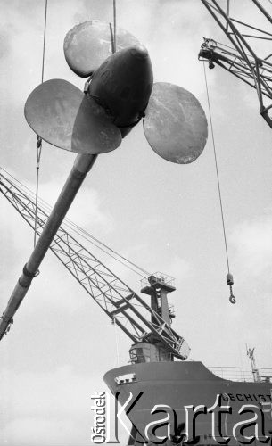 Stocznia Remontowa "Nauta", transport śruby okrętowej, w tle statek "Lechistan".