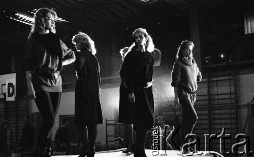 Wybory Miss Polonia 1987, próba przed półfinałem, dziewczyny na scenie, druga od prawej stoi Monika Nowosadko.