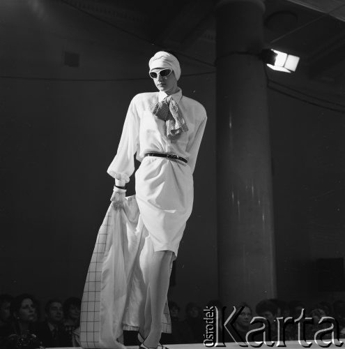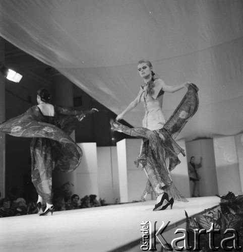 "Moda Polska", pokaz modeli z kolekcji wiosna-lato 1989, modelki w zwiewnych sukienkach.