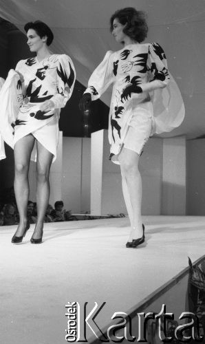 "Moda Polska", pokaz modeli z kolekcji wiosna-lato 1989, modelki w sukniach wieczorowych.