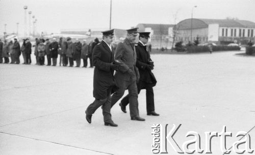 Lotnisko Okęcie, oficerowie Ludowego Wojska Polskiego niosący urny z ziemią przywiezioną z Katynia.