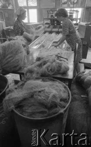 Pracownica Fabryki Wyrobów Lnianych w hali produkcyjnej.
