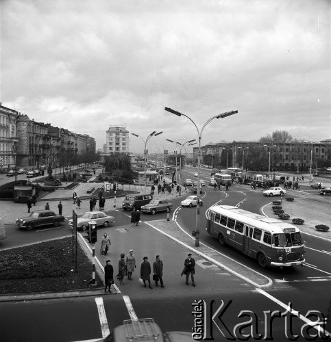 Samochody i autobusy przejeżdzające przez skrzyżowanie ulic: Nowy Świat i Aleje Jerozolimskie, na drugim planie siedziba Komitetu Centralnego Polskiej Zjednoczonej Partii Robotniczej.