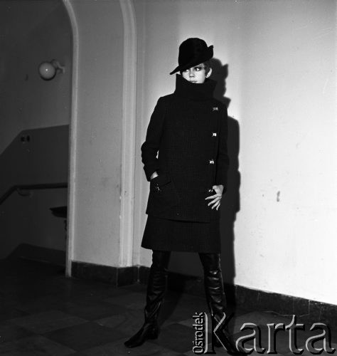 Moda Polska, kolekcja jesienna - modelka w czarnej kurtce, spódnicy typu mini, w butach z wysokimi cholewami oraz w czarnym kapeluszu.