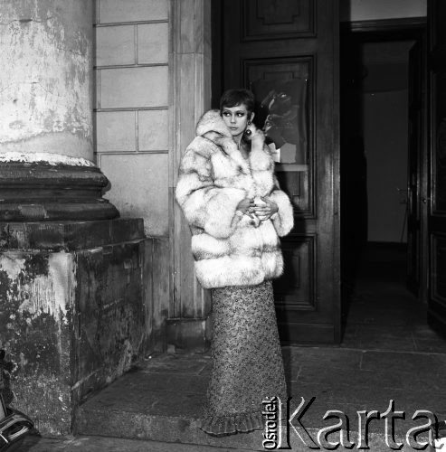 Moda Polska, kolekcja jesienna - modelka w jasnym futrze oraz w długiej, wzorzystej sukni zakończonej falbanką.