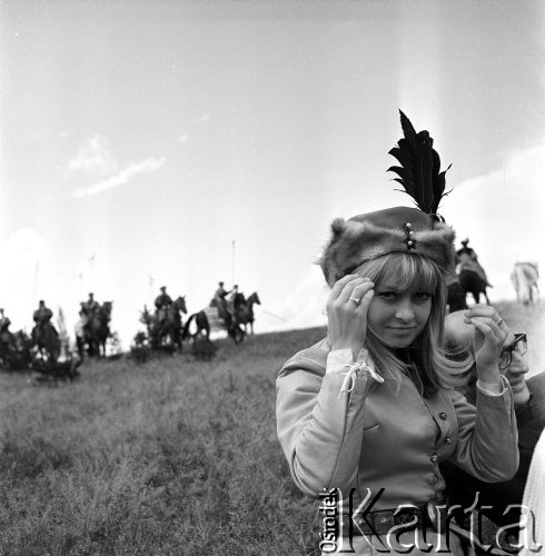 Film "Pan Wołodyjowski", reż. Jerzy Hoffman - plan filmowy. Na pierwszym planie Magdalena Zawadzka - odtwórczyni roli Barbary Jeziorkowskiej oraz operator Jerzy Lipman. W oddali - jadący konno mężczyźni ubrani w kostiumy historyczne.