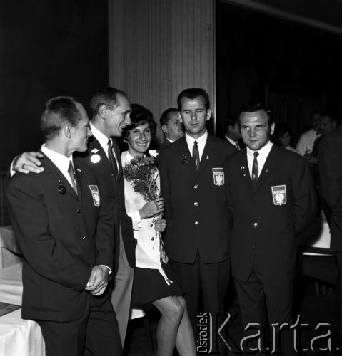 Uroczyste wręczenie odznaczeń przyznanych przez Polski Komitet Olimpijski za olimpiadę w Meksyku. Olimpijczycy pozują do pamiątkowego zdjęcia. Od lewej: sztangista Waldemar Baszanowski (złoty medal w podnoszeniu ciężarów w wadze do 67,5 kg), szermierz Jerzy Pawłowski (złoty medal w kategorii: szabla indywidualnie), lekkoatletka Irena Szewińska (złota medalistka w biegu na 100 metrów i brązowa medalistka w biegu na 200 metrów), pięściarz Jerzy Kulej (złoty medal w boksie w wadze lekkopółśredniej), NN.