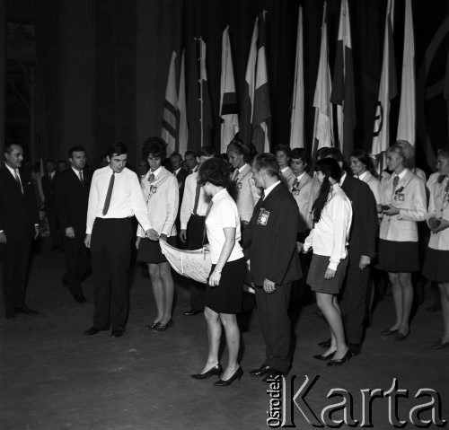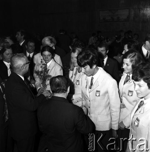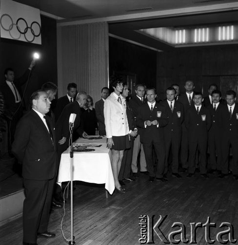 Uroczyste wręczenie odznaczeń przyznanych przez Polski Komitet Olimpijski za olimpiadę w Meksyku. Olimpijczycy (od lewej): lekkoatletka Irena Szewińska (złota medalistka w biegu na 100 metrów i brązowa medalistka w biegu na 200 metrów), NN, szermierz Jerzy Pawłowski (złoty medal w kategorii: szabla indywidualnie) oraz (w pierwszym rzędzie): sztangista Waldemar Baszanowski (złoty medal w podnoszeniu ciężarów w wadze do 67,5 kg), pięściarz Jerzy Kulej (złoty medal w boksie w wadze lekkopółśredniej), NN i pięściarz Artur Olech (srebrny medal w boksie w wadze muszej do 51 kilogramów), NN.