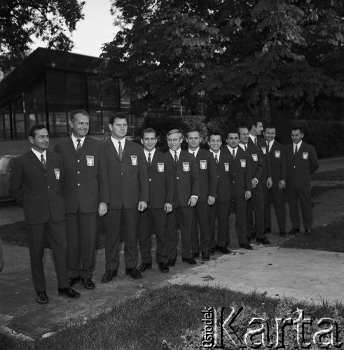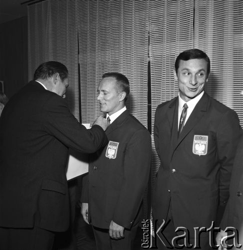 Polscy ciężarowcy przed wyjazdem na olimpiadę do Meksyku. Sztangista Waldemar Baszanowski otrzymuje odznaczenie od przedstawiciela Polskiego Komitetu Olimpijskiego. Po prawej stronie stoi sztangista Marek Gołąb.