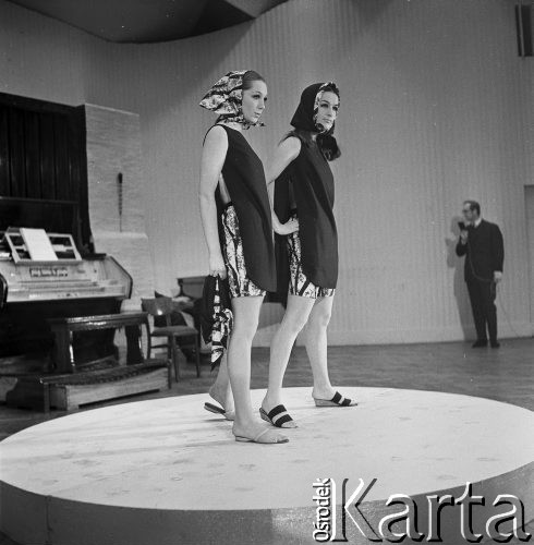 Pokaz setnej kolekcji firmy CORA zaprojektowanej przez Jadwigę Grabowską. Dwie modelki w chustach w kolorowe wzory i krótkich tunikach, w tle konferansjer.