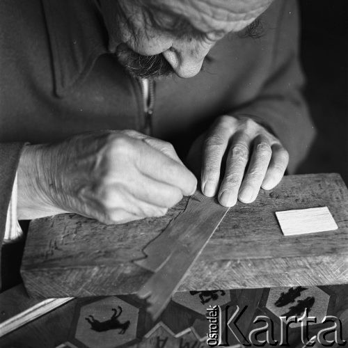 Praca Leona Kuźmińskiego (95lat) przedstawiająca herby miast polskich, wykonana techniką intarsji.