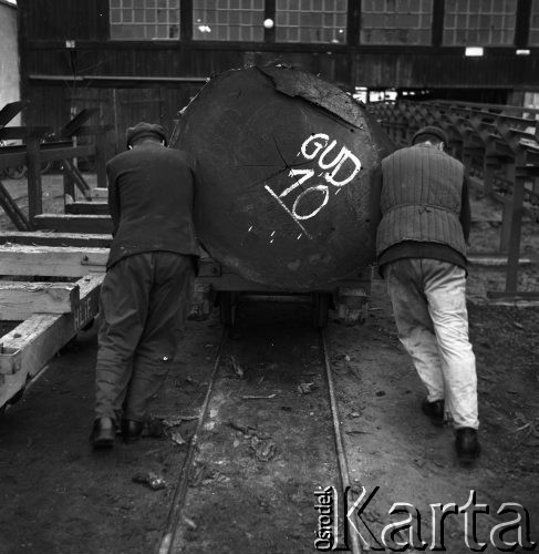 Pracownicy Zakładów Przemysłu Drzewnego transportujący drewniane bale do hali produkcyjnej.