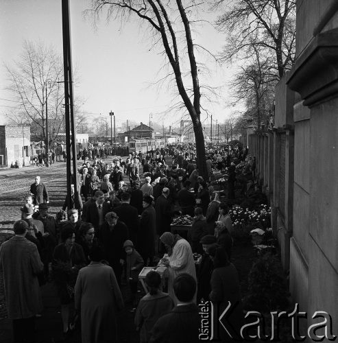 Święto Zmarłych na Starych Powązkach. Stoiska ze zniczami i chryzantemami obok muru cmentarza, z lewej tramwaj linii 22 kursującej z Powązek na Dworzec Wschodni.