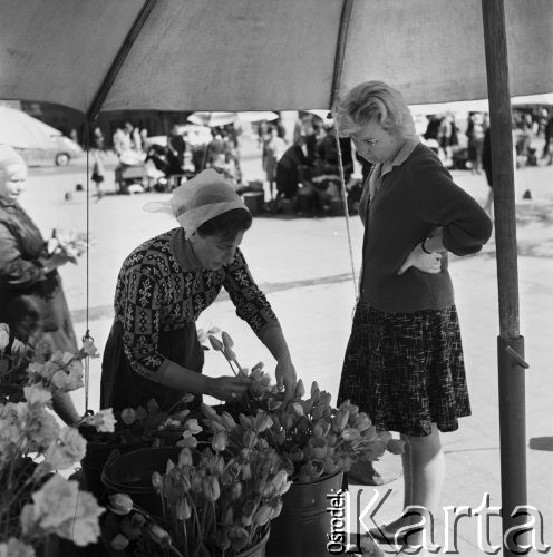 Rynek Główny w Krakowie. Kobiety kupujące tulipany u krakowskiej handlarki, w tle tłum ludzi stojący pod Kościołem Mariackim.
